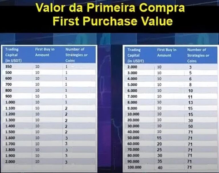 Utilize a tabela abaixo para calcular o valor da sua banca e número de moedas para realizar os trades.